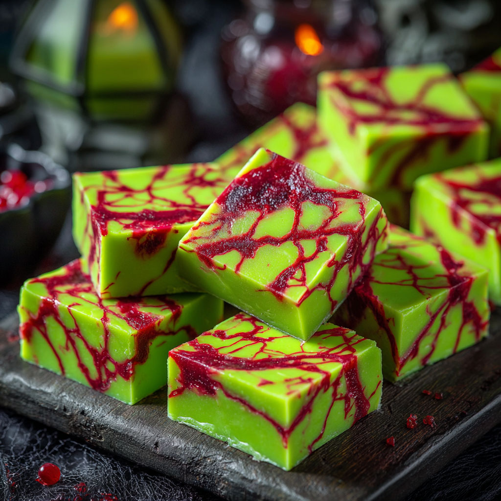 If you’re looking to impress (and maybe frighten) your guests this Halloween, this Zombie Vein Fudge is the ultimate treat. It’s a deliciously rich, sweet, and spooky dessert that looks straight out of a monster movie. The vibrant green fudge base, marbled with red “veins,” creates a gory visual that’s both unsettling and irresistible at the same time. It’s one of those desserts that make people stop, stare, and then reach for seconds.